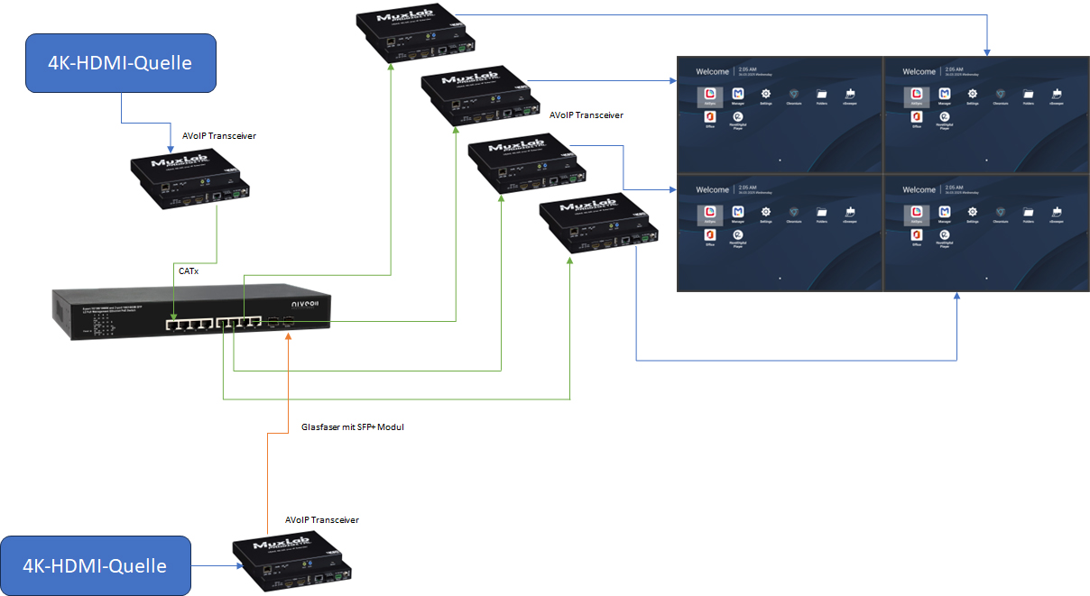 Gesucht ist ein AV over IP-System, dass SDVoE-konform (10G) vier HDMI-Signale auf ein Multiview-Display übertragen kann. Weitere Decoder sollen über eine Glasfaser-Verbinung mit an dem zentralen Netzwerk-Switch betrieben werden können;