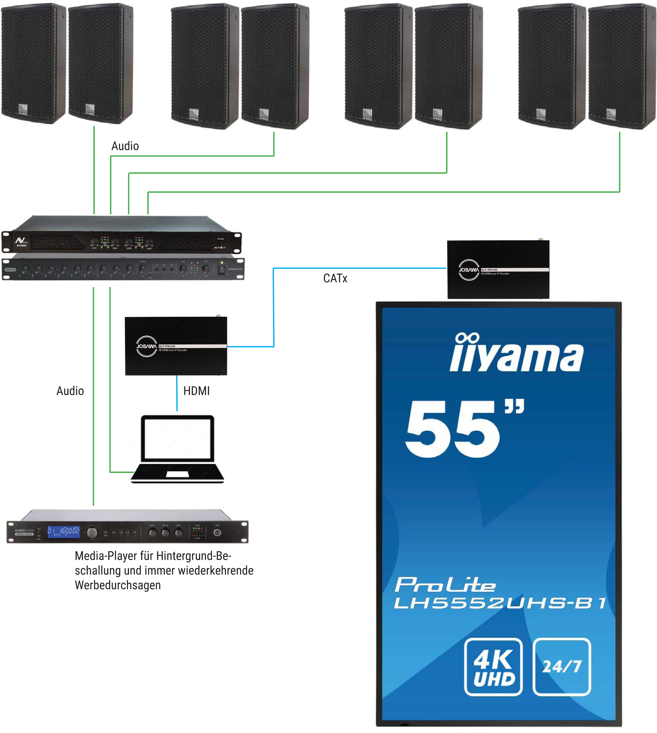 Für die wiederkehrenden Werbebotschaften kommt eine AMC WeeklyPlayer zum Einsatz. Er ist in der Lage, Audiodateien gemäß dem auf einer SD-Karte aufgeführten Zeitplan abzuspielen. Dieser Player kann aber auch beliebige Musik abspielen und bietet zusätzlich einen Mikrofoneingang für eine mögliche Durchsage oder eine neue Produktvorstellung.