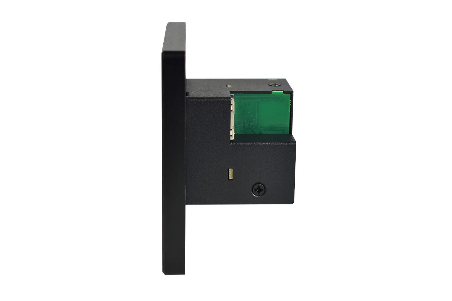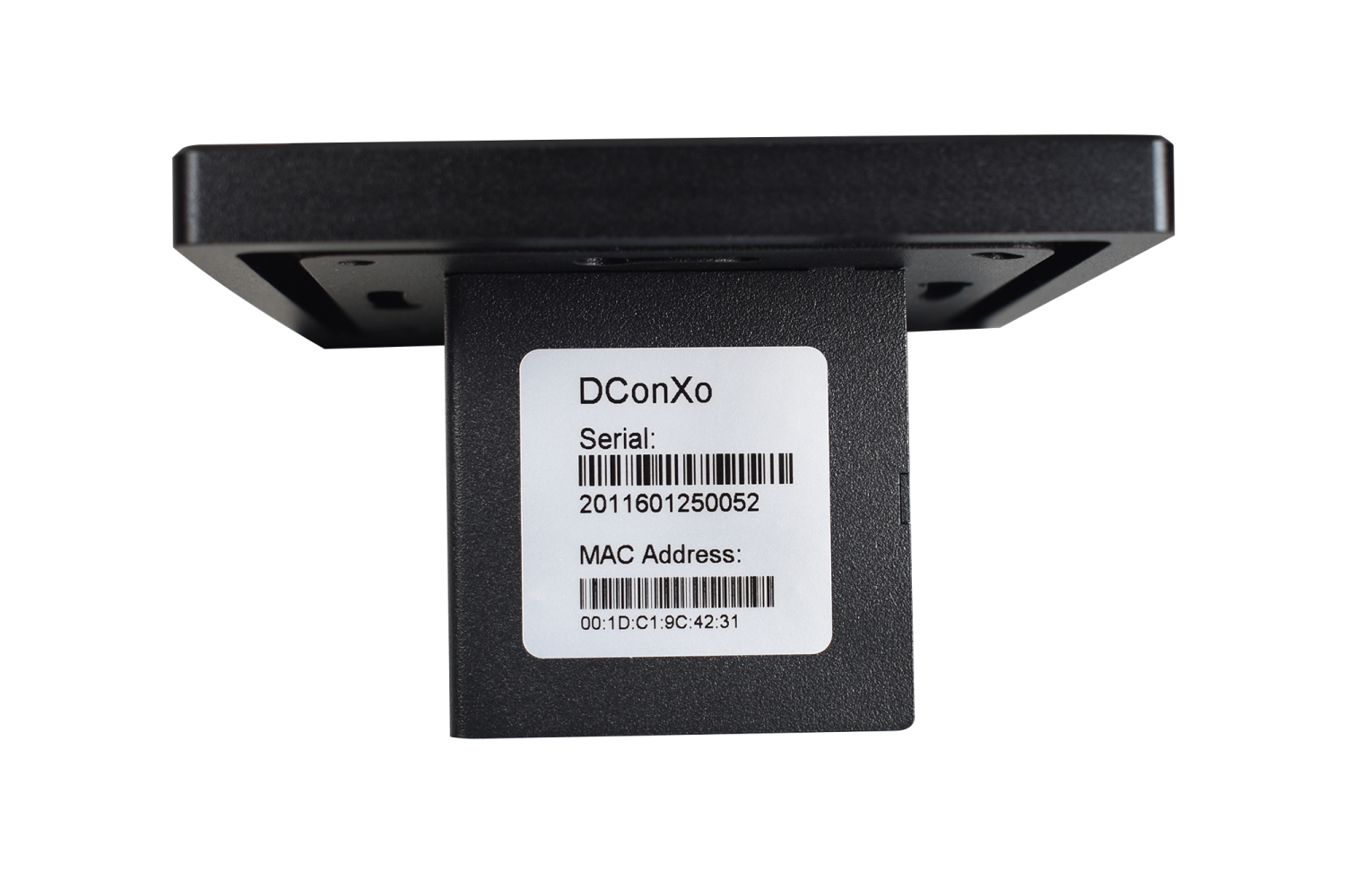Die Befestigungsplatte kann mit zwei Schrauben, die 60 mm voneinander entfernt sind, entweder horizontal oder vertikal, in einer Unterputzdose montiert werden. DCon wird mit einem 90 x 90 mm Rahmen geliefert. Alternativ kann auch jeder von diversen Schaltgeräteherstellern bereitgestellte Rahmen verwendet werden, der der DIN 49 075 (50 x 50 mm Frontplatte) entspricht.