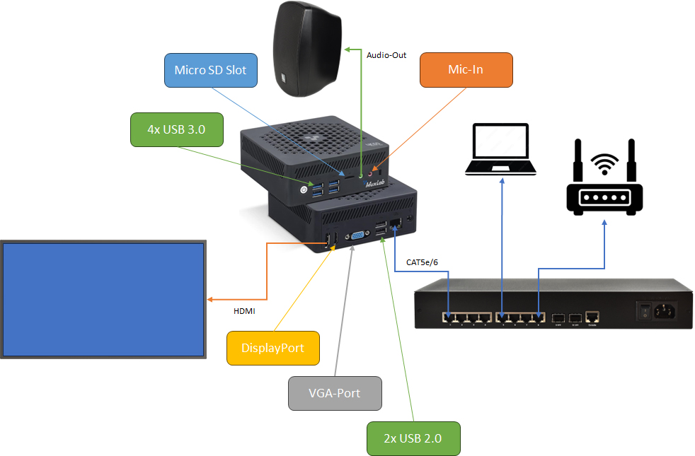 - Kompatibilität mit vorhandener Hardware (Displays, Projektoren) und Infrastruktur (Netzwerkverkabelung, Stromversorgung).