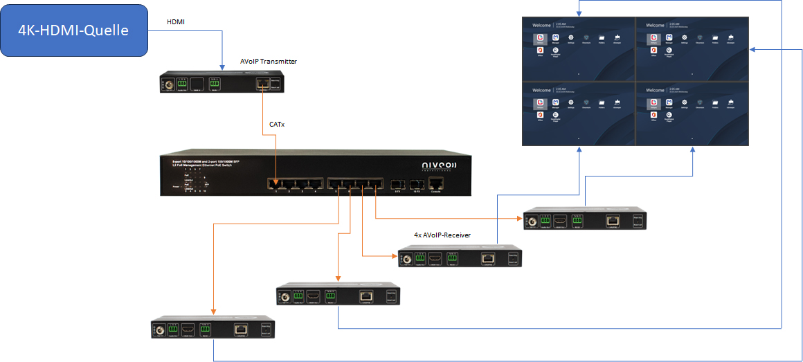 Diese Lösung bietet völlige Flexibilität hinsichtlich der Anzahl der Quellen und Displays und kann aufgrund der dezentralen Struktur ohne Änderung des Systems erhöht werden. Alle IPK1E und IPK1HD Geräte können über PoE oder das mitgelieferte Netzteil mit Strom versorgt werden. Die IP2-Produktreihe verwendet die H.265-Codierung, um je nach verwendetem Anzeigegerät ein Bild mit 4K @ 60Hz oder niedriger zu erzeugen. Da das System Unicast verwendet, ist kein Managed Switch erforderlich, und wenn ein Managed Switch verwendet wird, ist keine Konfiguration erforderlich.