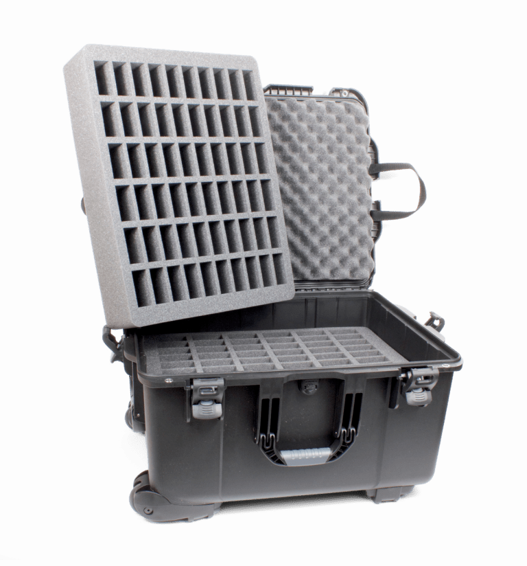 Dieser Koffer verfügt über einen unteren Schaumstoffeinsatz mit 60 Steckplätzen und einen oberen Schaumstoffeinsatz mit 60 Steckplätzen – insgesamt 120 Steckplätze.