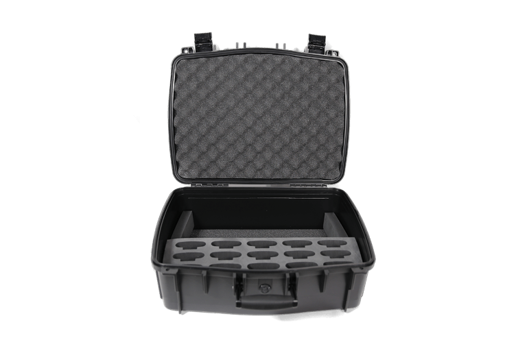Schaumstoffeinsatz mit 15 Steckplätzen für PPA T46-Sender, FM-, IR- und Loop-Bodypack-Empfänger sowie Digi-Wave DLT-Transceiver und DLR-Empfänger.
