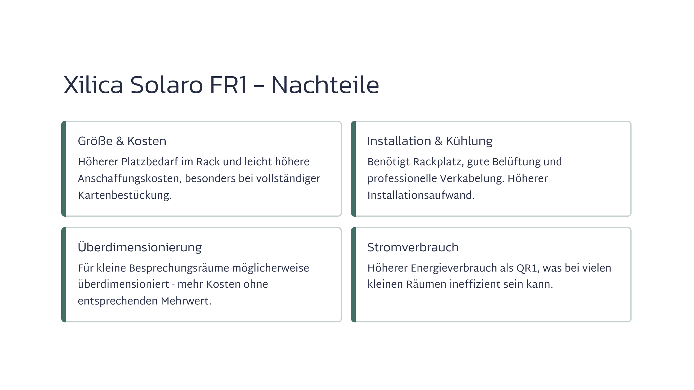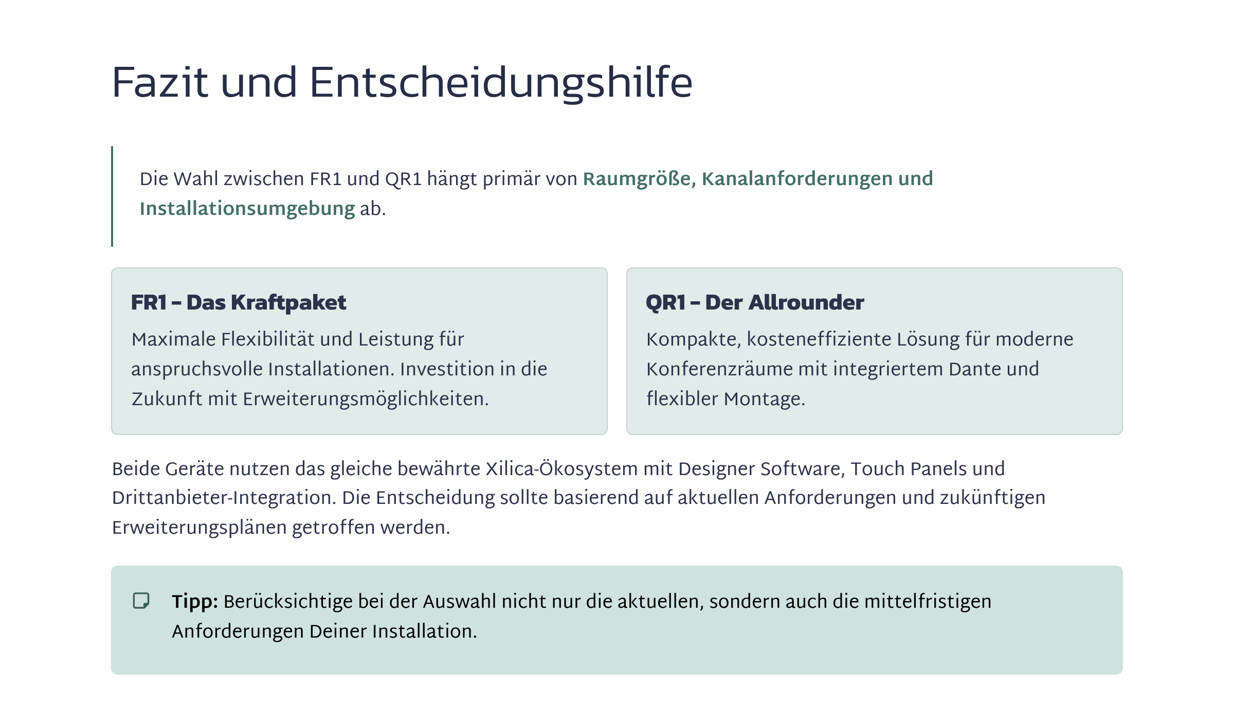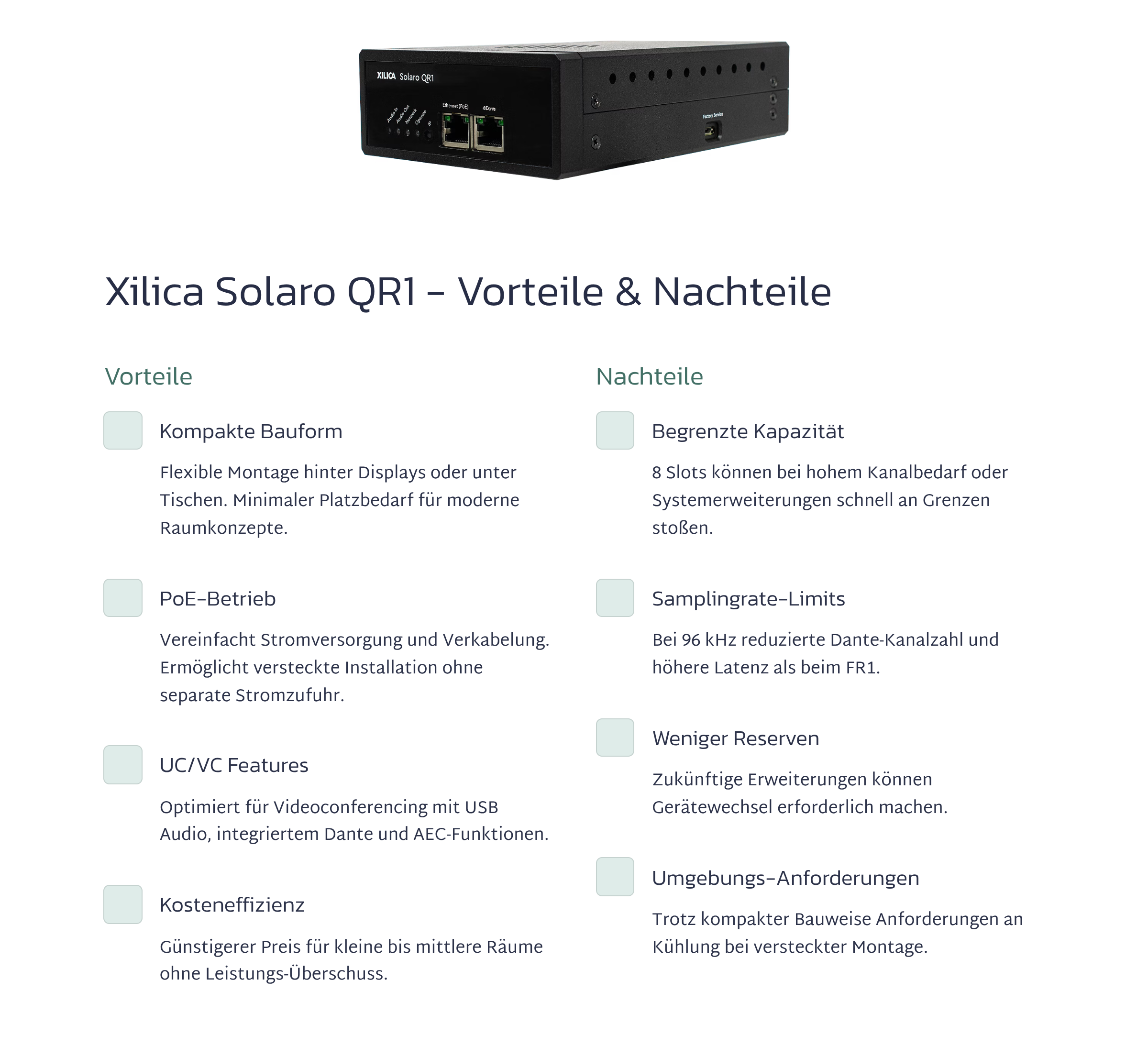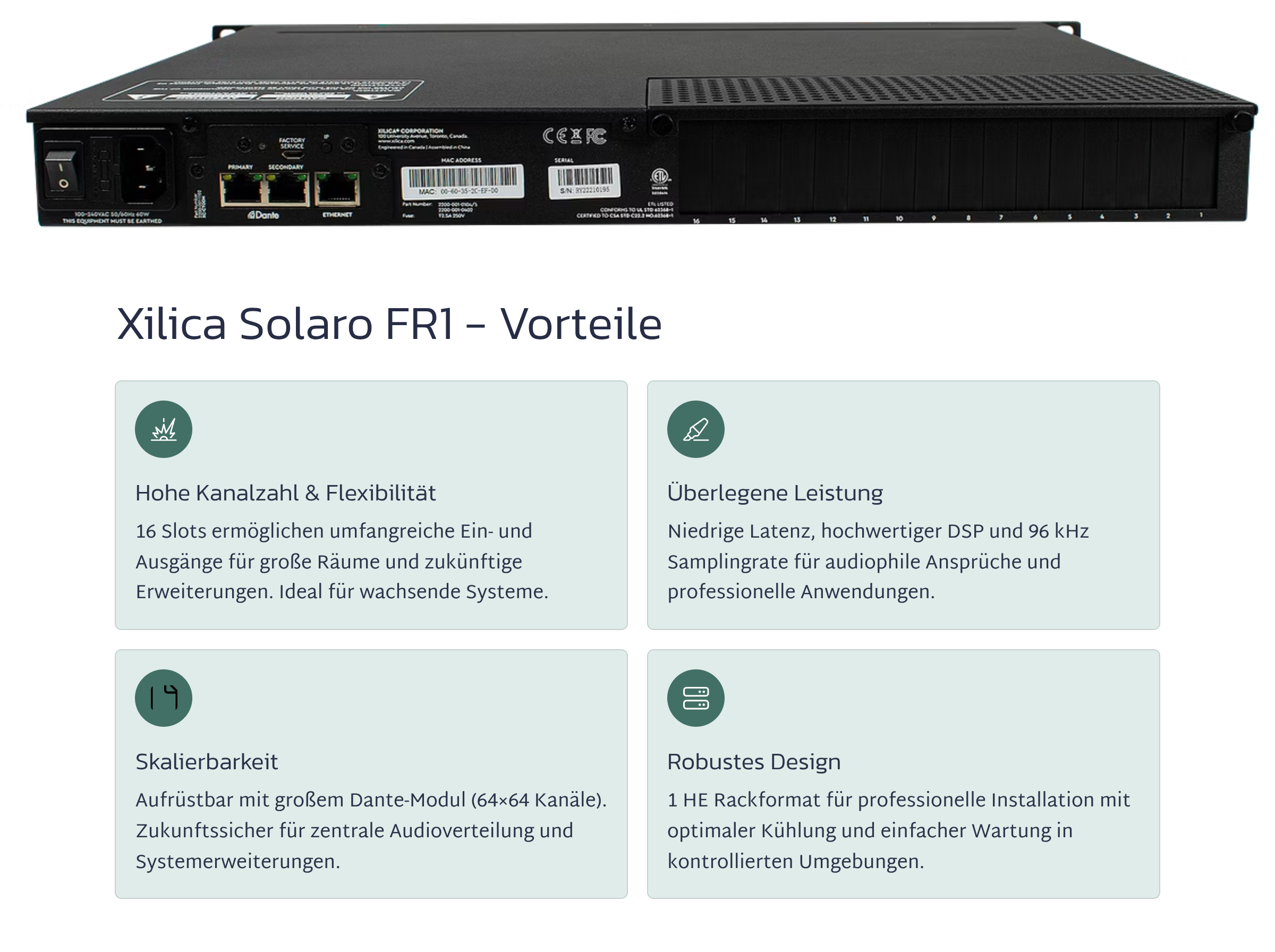 Der Xilica Solaro FR1 ist das ultimative Audio-Routing- und Signalverarbeitungsgerät für jede professionelle Anwendungen. Ob in Live-Sound-Installationen, Konferenz- und Medienräumen oder Aufnahmestudios, mit einer Fülle von erstklassigen Funktionen setzt der FR1 den heutigen Standard. Der Xilica Solaro FR1 verfügt über eine fortschrittliche Signalverarbeitungstechnologie, die eine außergewöhnliche Audioqualität gewährleistet.
