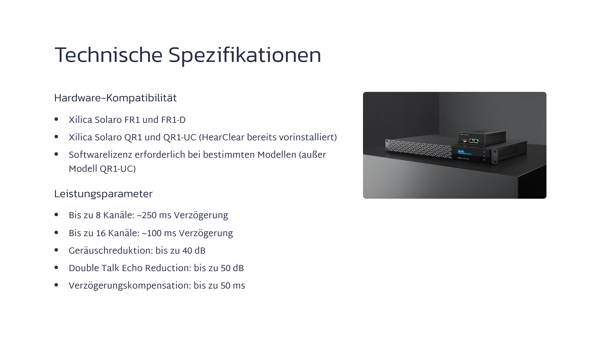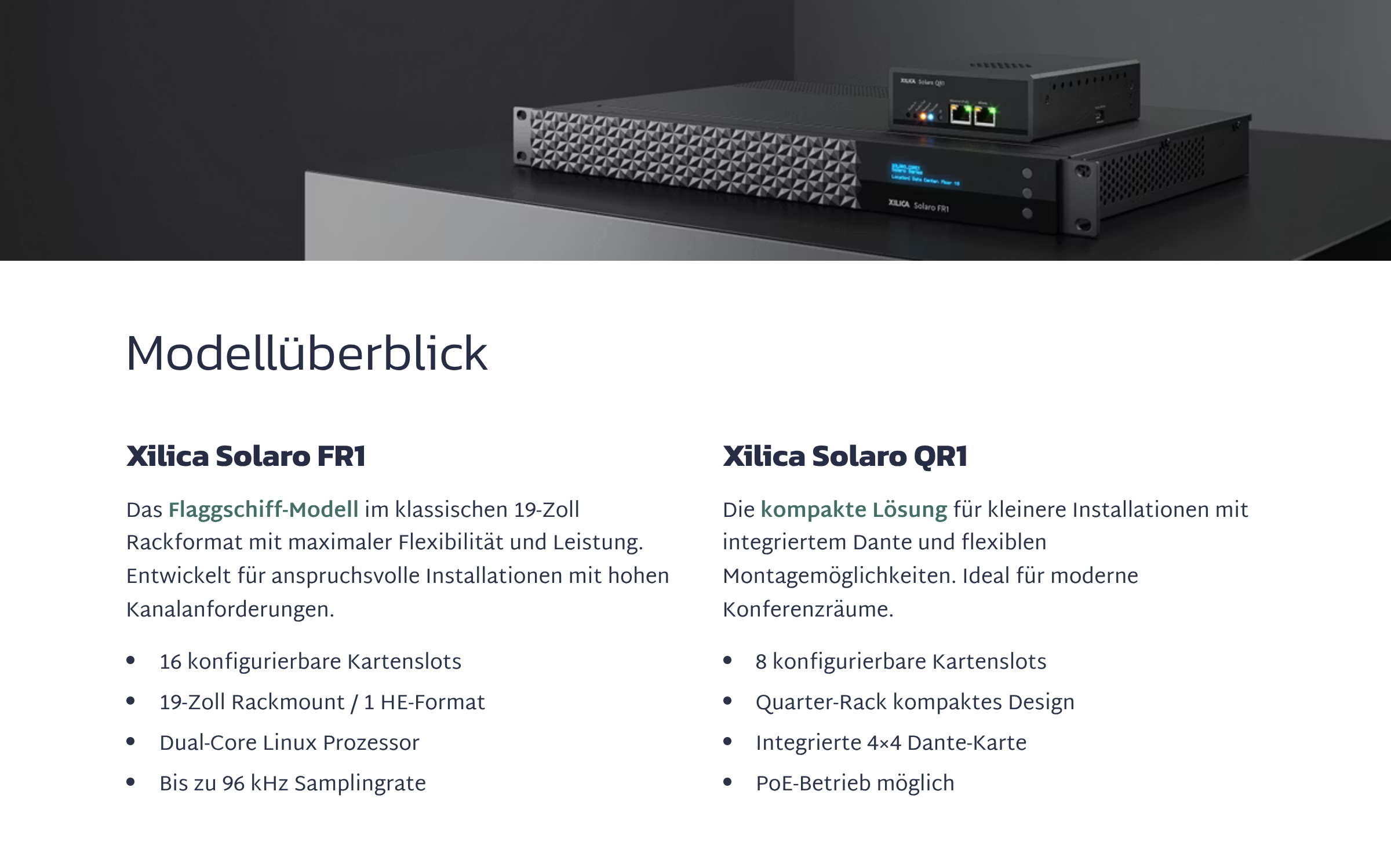 Xilicas digitaler Signalprozessor mit offener Architektur kann mit jeder beliebigen Kombination von Ein-/Ausgangs-Karten der Solaro-Serie bestückt werden und bietet Funktionen wie analoges Audio, USB (mit Lautstärke-/Mute-HID-Unterstützung), GPIO, Relaissteuerung und AES/EBU-Digitalaudio. Mit dem Modell FR1-D stehen zusätzlich bis zu 64×64 bidirektionale Audiokanäle mit Dante über standardmäßige CATx-Kabel und ohne proprietäre Switches zur Verfügung.
