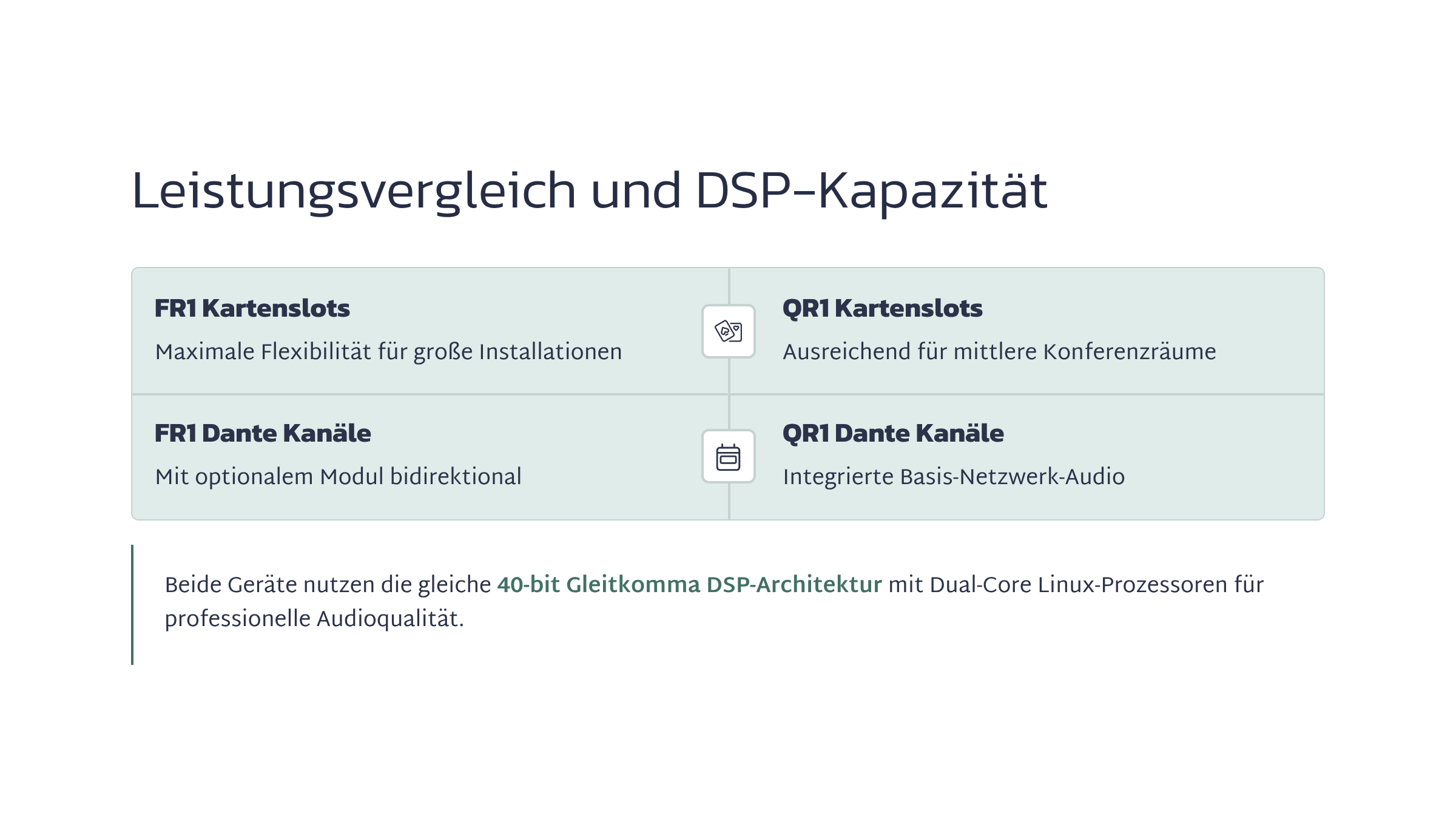 Mit einer Abtastrate von 48 kHz (umstellbar auf 96 kHz) und einem 40-Bit Floating-Point Prozessor liefert er einen kristallklaren Klang und eine präzise Audiowiedergabe. Mit seiner beeindruckenden Anzahl von Ein- und Ausgängen ermöglicht der FR1 über ein flexibles Signalrouting. Er ist dazu mit 16 Kartenslots ausgestattet, die es ermöglichen, optional erhältliche Einschubkarten je nach Bedarf zu ergänzen und das gesamte System auf die eigenen Bedürfnisse abzustimmen. Eingesetzt wird nur das, was auch benötigt wird. Keine ungenutzten Kanäle mehr!