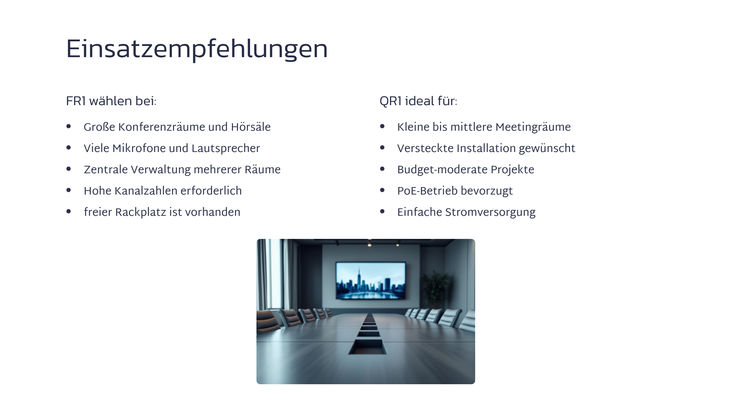 Darüber hinaus verfügt dieses Gerät über eine benutzerfreundliche Oberfläche, die eine einfache und intuitive Bedienung ermöglicht. Das integrierte OLED-Display bietet dazu eine übersichtliche Darstellung und eine einfache Navigation durch die Menüs und Einstellungen. Als Teil des Dante-Systems ermöglicht die FR1-D Modellvariante eine nahtlose Integration in jede Dante-Netzwerk-Umgebungen. Mit Dante kann man Audio über ein IP-Netzwerk übertragen, was zu einer flexiblen und skalierbaren Lösung für komplexe Audiorouting-Anforderungen führt.