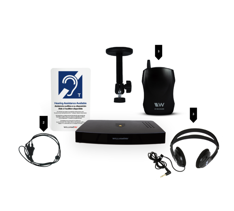 Im Zentrum des Systems steht der leistungsfähige IR T3 Medium‑Area Transmitter, der mit fortschrittlicher LED‑Technologie arbeitet und eine große Hörfläche von bis zu ca. 2.972 m² abdeckt, während drei Handheld‑Empfänger das infrarote Audiosignal aufnehmen. Die mitgelieferten faltbaren Kopfhörer sorgen für komfortables, privates Hören, und die Induktions‑Neckloops bieten zugleich T‑Spulen‑Kompatibilität für Hörgeräte. Zusätzlich sind Montagematerialien / ADA‑Hinweisschild und ein internes Netzteil enthalten, um eine barrierefreie und regelkonforme Installation zu gewährleisten.