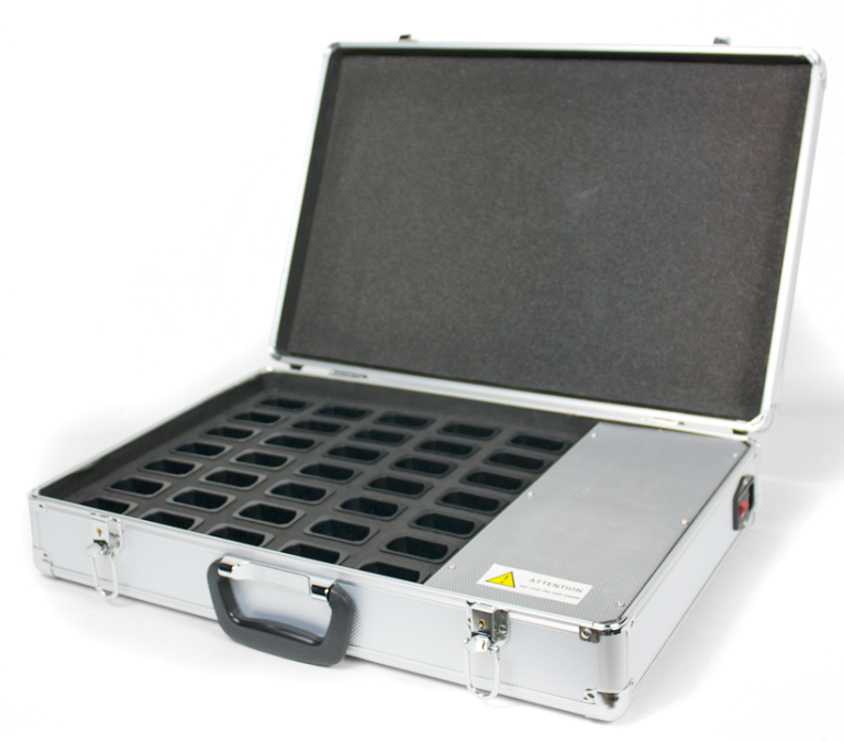 - 1 × CHG‑863‑35 Ladegerät im Transportkoffer‑Format mit bis zu 35 Ladeschächten für FM/UKW‑Assistive‑Listening‑Sender/Empfänger.